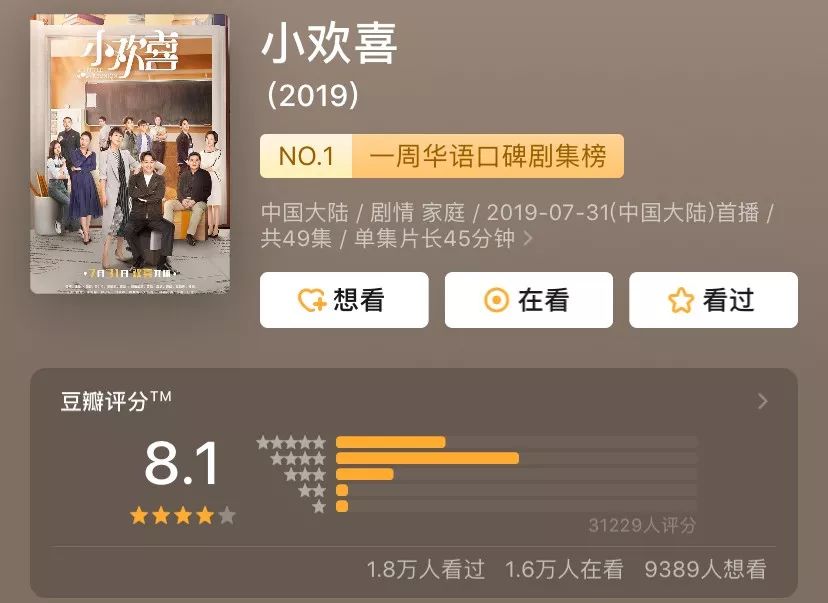 从评分人数上也能看出,教育剧不及大IP和甜剧吃香。到现在,拿下豆瓣8.1高分的《小欢欣》,有30741人参加评分;而一起期的《陈情令》却有449566人,《亲爱的酷爱的》为234214人,《长安十二时辰》为252202人。占有上半年收视冠军的《少年派》,终究也只收成了47616人的评分,和爆热的网剧都不是一个量级。