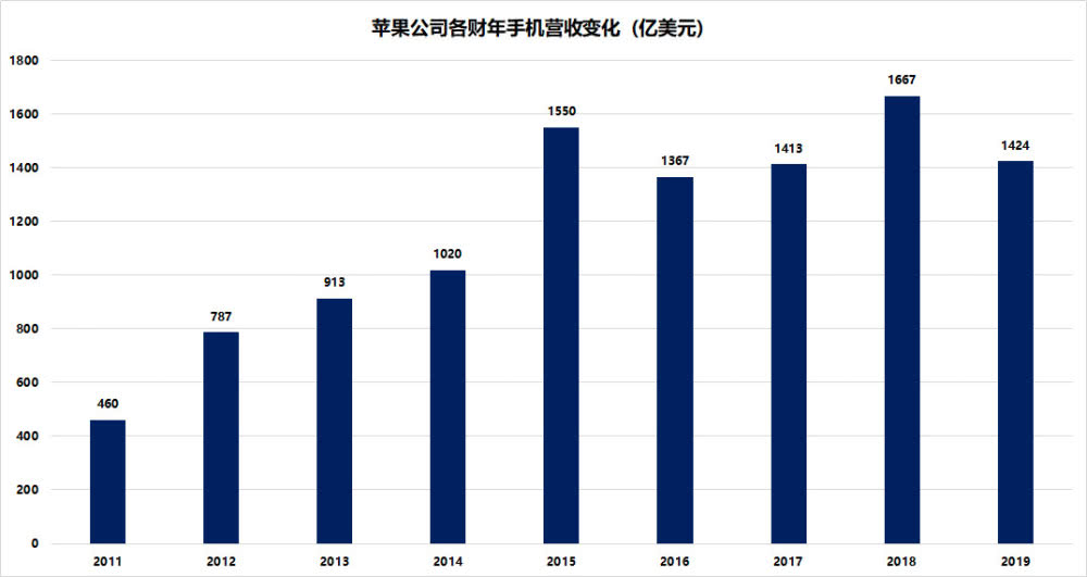 事实上,根据苹果公司的财报显示,苹果公司在2015年就陷入了盈利停滞,并在2016财年和2017财年连续两年盈利低于500亿美元后,直到2018财年才实现了大突破,而这次突破在2019财年又以营收和利润的双下滑再次陷入停滞。