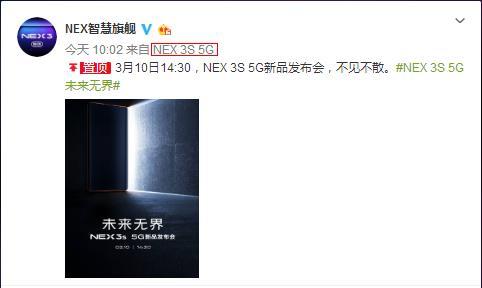 今日,vivo旗下 @NEX才智旗舰 官方微博发文称,“3月10日14:30,NEX 3S 5G新品发布会,不见不散。#NEX 3S 5G未来无界# ”由此来看,官方应该是再次拉开了vivo旗下又一款5G旗舰新机的预热。依据官博案牍和发布的预热海报来看,此次线上发布会的主题为“未来无界”,而从海报上显现的这款新机的剪影来看,其也的确承载了NEX系列“打破鸿沟,引领未来”的品牌理念,正面应该与NEX3相同选用了真全面“瀑布屏”的屈服,而由此估测,该机应该仍将选用升降式前摄。