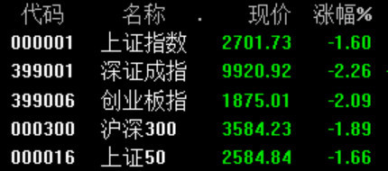 到午间收盘,沪指跌1.6%,报收2701点;深成指跌2.2%,报收9920点;创业板指跌2.0%,报收1875点。