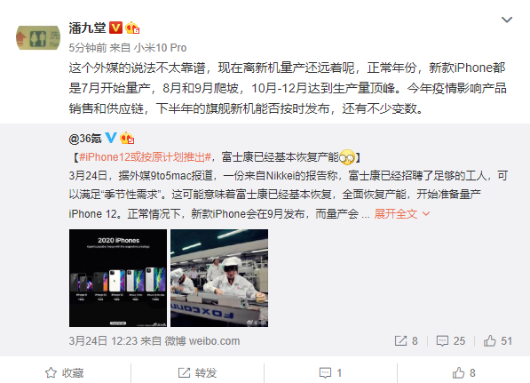 潘九堂以为,外媒给出富士康康复产能能够让iPhone 12按计划发布的音讯并不靠谱,由于正常年份,新款iPhone都是7月开端量产,8月和9月爬坡,10月-12月到达生产量高峰。